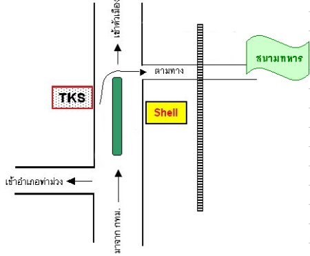 แผนที่ครับ หาไม่ยากหรอก เลยทางสามแยกที่จะเข้าท่าม่วง ให้ตรงมา ประมาณ 1 กม เจอปั๊ม Shell ด้านขวามือ เจอร้านทำกันชน TKS ด้านซ้าย เลยร้านนี้ไป เกาะกลางถนนเกาะแรก ให้เลี้ยวขวาเข้าซอยไปเลยครับ ตามทางเข้าไป ผ่านทางรถไฟ จากปากทางเข้าถึงตัวสนามไม่เกิน 1.5 กม ลองดูนะครับ