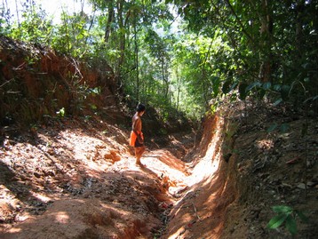 เลยเขาหัวโล้นมาได้กิโลกว่า ๆ หรือทั้งหมดเกือบ 10 กิโลจากปากทางเข้า ก็มาถึงร่องน้ำกว้างกว่าตัวรถที่เอียงลึก