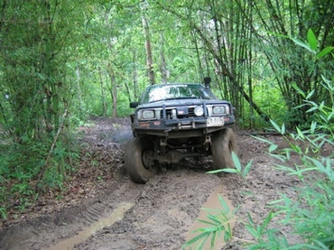 ... เส้นทางช่วงแรกไม่มีอะไร หลุมลึก หรือร่องโหด ๆ มีทางหลบมากมาย เรียกได้ว่า รถขับสองก็น่าจะเข้าได้ช่วงหนึ่งกิโลเมตรแรก กับในภาพที่วิ่งตามกันมาอย่างสดชื่นในป่าฝน