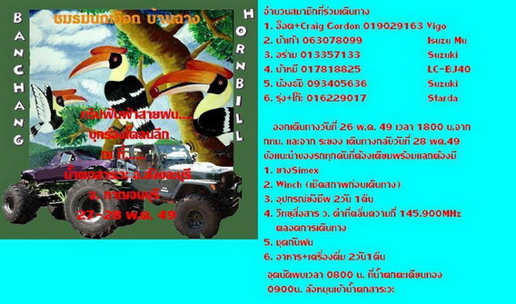 ถ้าน้อยๆมี2คันจะไปทำไมล่ะครับ? จุดหมายการเล่นออฟโรดของผมไม่ใช่เล่นทางหรือเล่นรถ ผมชอบบรรยากาศการเดินทาง กับ จุดหมายปลายทางมากกว่าครับ ไปกันพอประมาณช่วยเหลือแซวกันหนุกหนานดี ไปน้อย2คันไม่ไป..ชัวร์ ยิ่งไปกับหนูขาวด้วยยิ่งไม่ไปใหญ่เลย เพราะบรรยากาศการเดินทางมันจะสั้นมาก ทั้งเจ้าหนูขาว และ เจ้าโคขุน ทั้งรถทั้งคนมันพร้อมตลอด คงใช้เวลาไม่นานในการเดินทาง สีสันระหว่างทางคงไม่มีแน่ จริงม๊ะ...หนูขาว