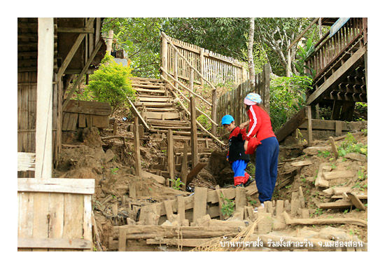 จนเรือพาเรามาถึงหมู่บ้านท่าตาฝั่ง ต้องปีนบันไดจากชายฝั่งขึนไปยังหมู่บ้าน