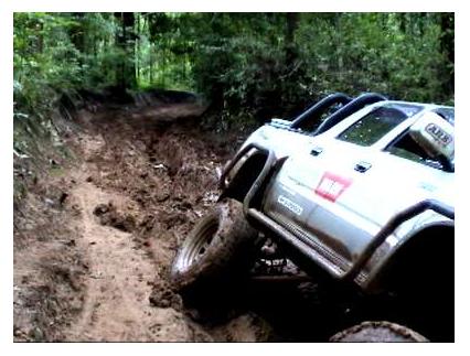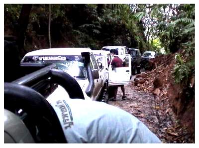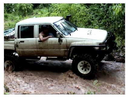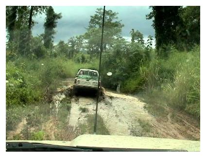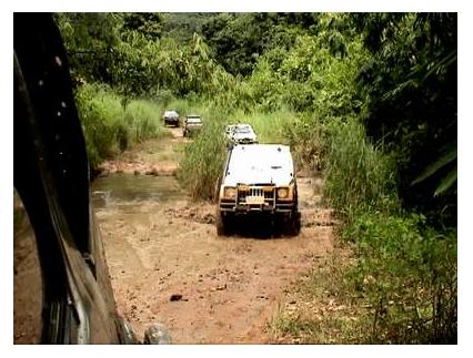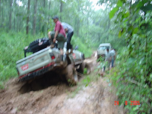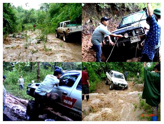 ... ในขณะที่ผมกำลังสาละวนลากสายพานไปดึงเกี่ยว เจ้าเสือซ่า นักบู๊บูรพารุ่นน้องที่จมปลักแม้ขนาดยาง Simex 34 พร้อม Air locker หน้า + หลังก็ตามมี ก็มีเสียง ลั่นกึกก้องจากด้านทิศตะวันตกเข้ามาหาอย่างรวดเร็ว .. เสียงมันเหมือนมีใครเอาพัดลมขนาดใหญ่ เป็นร้อย ๆ ตัวมาเป่าอยู่ตามยอดไม้ที่รายรอบตัว เสียงเหมือนพายุเข้ามา แต่อีกใจหนึ่งก็คิดว่าไม่น่าจะใช่ เพราะไม่มีเค้าเมฆฝน หรืออะไรบอกเลยว่าจะมีพายุมา .. เพียงเสี้ยวนาทีแห่งความคิดคำนึงนั้น ผมได้เห็นแนวป่าด้านหน้าไหวยวบมาเป็นทางพร้อมกับห่าฝนที่เข้ามาถึงตัวจนเจ็บไปหมด พร้อมวิ่งหนีกลับไปที่รถ เพราะนึกพรั่นพรึงว่าจะมีลูกเห็บตามมาด้วย แต่ก็ยังไม่ทันแม้ห่างจากตัวรถไม่ถึง 10 เมตรก็ตามที ผมแอบอยู่ข้างเจ้าหนูขาวอยู่สักอึดใจได้ พายุฝนนั้นก็เริ่มคลายความหนาแน่นและความรุ่นแรงลงไป แต่ถึงอย่างนั้นก็ตามที ก็จัดเป็นพายุฝนขนาดใหญ่พอสมควร ที่ไม่สามารถหยุดพวกเรา กลุ่มบูรพา และ กลุ่มพี่เล็กสามช่าลงได้ เรายังคงเดินหน้าไปต่อ โดยหารู้ไม่ว่า เราะกำลังจะเจอกับน้ำป่าในอีกไม่กี่นาทีข้างหน้า !!!