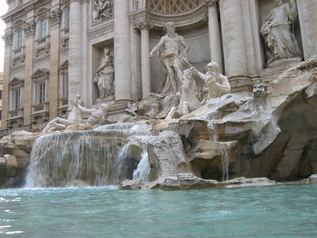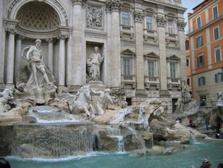 ตาน้ำพุดชานกรุงโรม ด้านหลังมีสถาปัตยกรรมปู้นปั้น