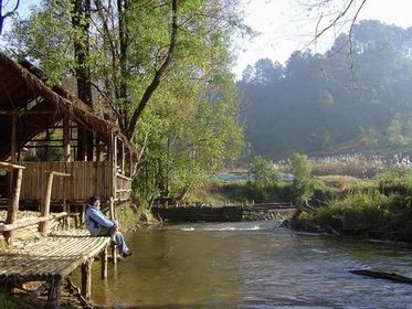 บรรยากาศริมน้ำใสๆต้นน้ำของแม่แตงที่ไหลผ่านหมู่บ้านดอยดำ เปรียบเสมือนเส้นหล่อเลี้ยงความชุ่มชื้นของพื้นที่นี้