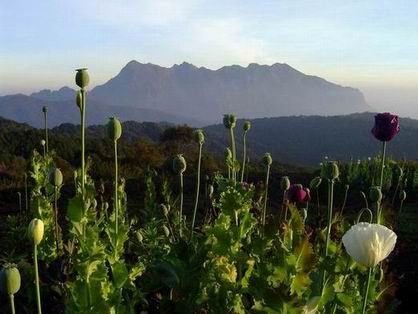 ยอดดอยหลวงเชียงดาวกับดอกฝิ่นที่ปลูกไว้หน้าสถานี เหมือนกับจะบอกว่าอดีตนั้นที่ดอยเชียงดาวนี้ก็คือแหล่งปลูกฝิ่นแหล่งใหญ่ทีเดียว