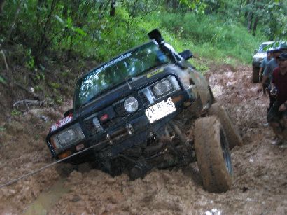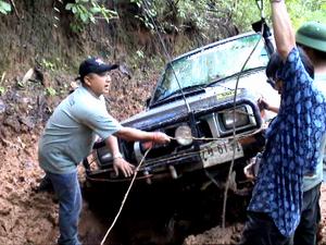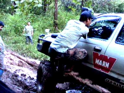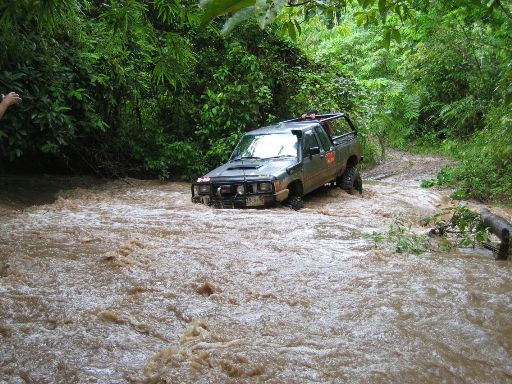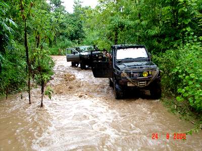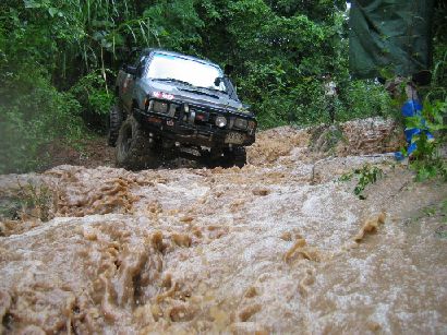 ... ในขณะที่ผมกำลังสาละวนลากสายพานไปดึงเกี่ยว เจ้าเสือซ่า นักบู๊บูรพารุ่นน้องที่จมปลักแม้ขนาดยาง Simex 34 พร้อม Air locker หน้า + หลังก็ตามมี ก็มีเสียง ลั่นกึกก้องจากด้านทิศตะวันตกเข้ามาหาอย่างรวดเร็ว .. เสียงมันเหมือนมีใครเอาพัดลมขนาดใหญ่ เป็นร้อย ๆ ตัวมาเป่าอยู่ตามยอดไม้ที่รายรอบตัว เสียงเหมือนพายุเข้ามา แต่อีกใจหนึ่งก็คิดว่าไม่น่าจะใช่ เพราะไม่มีเค้าเมฆฝน หรืออะไรบอกเลยว่าจะมีพายุมา .. เพียงเสี้ยวนาทีแห่งความคิดคำนึงนั้น ผมได้เห็นแนวป่าด้านหน้าไหวยวบมาเป็นทางพร้อมกับห่าฝนที่เข้ามาถึงตัวจนเจ็บไปหมด พร้อมวิ่งหนีกลับไปที่รถ เพราะนึกพรั่นพรึงว่าจะมีลูกเห็บตามมาด้วย แต่ก็ยังไม่ทันแม้ห่างจากตัวรถไม่ถึง 10 เมตรก็ตามที ผมแอบอยู่ข้างเจ้าหนูขาวอยู่สักอึดใจได้ พายุฝนนั้นก็เริ่มคลายความหนาแน่นและความรุ่นแรงลงไป แต่ถึงอย่างนั้นก็ตามที ก็จัดเป็นพายุฝนขนาดใหญ่พอสมควร ที่ไม่สามารถหยุดพวกเรา กลุ่มบูรพา และ กลุ่มพี่เล็กสามช่าลงได้ เรายังคงเดินหน้าไปต่อ โดยหารู้ไม่ว่า เราะกำลังจะเจอกับน้ำป่าในอีกไม่กี่นาทีข้างหน้า !!!