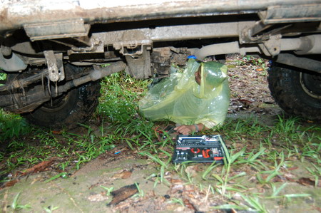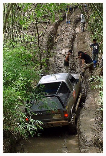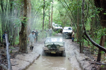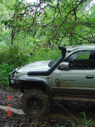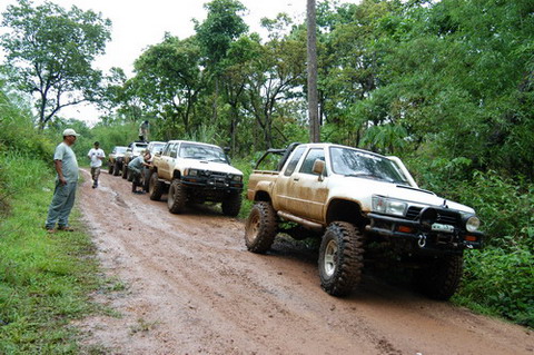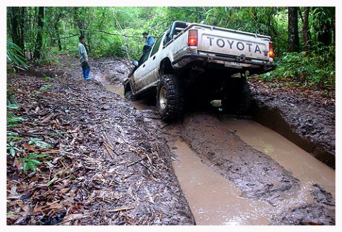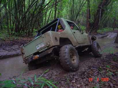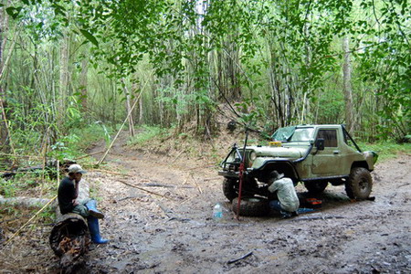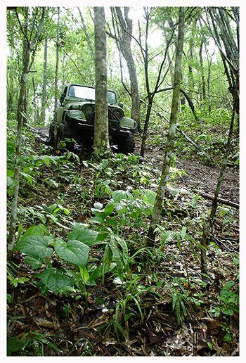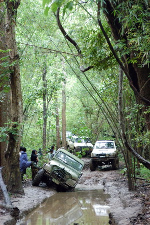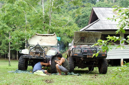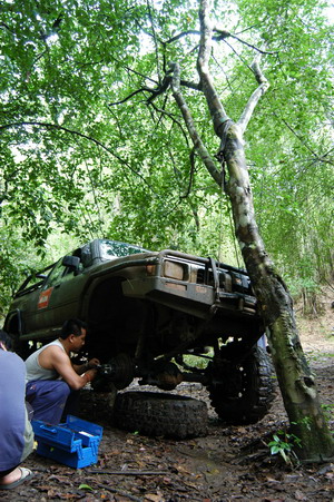 ภาพนี้จอดสงบนิ่งอยู่กลางทางหน้าแคมป์ เจ้าของกำลังประเมินความเสียหาย ส่วนลูกชายก็กำลังนั่งคิดอะไรอยู่บนตอไม้ น่าจะคิดว่า " เฮ้อ บอกพ่อแล้วว่าให้ซ่อมให้ดีก่อนเข้าป่า"
