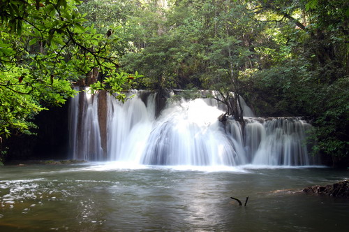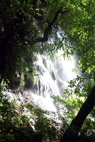 เมื่อไต่จากชั้นที่ 2 ลงมาแล้วเดินสักพัก ภาพน้ำตกชั้นที่ 1 สาดกระทบกับแสงแดดทะลุซุ้มไม้ก็เริ่มปรากฏชัด