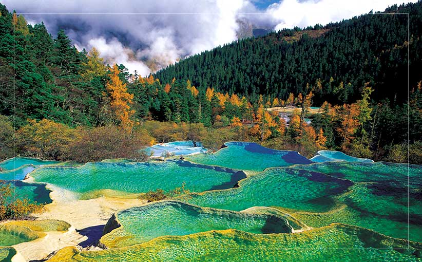 นำท่านเดินทางสู่ วนอุทยานสวรรค์จิ่วไจ้โกว ณ ดินแดนแห่งนี้มีหมู่บ้านเก่าแก่ชาวธิเบตอยู่ 9 แห่ง ซึ่งอยู่กระจัดกระจายในวนอุทยานแห่งนี้ และนี่คือที่มาของ จิ่วไจ้โกว อุทยานแห่งชาติประกอบด้วย ภูเขา และหุบเขาสลับกันในระดับความสูงกว่า 1,140 เมตร เหนือระดับน้ำทะเล ถึง 4,588 เมตร ที่ยอดเขาสูงสุดระดับพื้นดินลดหลั่นทำให้เกิดแอ่งน้ำ 114 แอ่ง มีขนาดตั้งแต่แอ่งเล็ก ไปจนถึงทะเลสาบใหญ่ กับน้ำตกมโหฬาร น้ำตกที่ใหญ่ที่สุด ความกว้าง 300 เมตร ธรรมชาติที่สวยงามเป็นที่สุด แม่น้ำ 5 สาย หาดทราย และตาดหินปูน 5 จุด ทะเลสาบห้าสี ความมหัศจรรย์ของอุทยานแห่งนี้คือสภาพของน้ำในแอ่งซึ่งมีสีสันพิสดารหลากหลายดุจเนรมิตกับลีลาฤดูกาลที่หมุนเวียน สร้างสีสันให้ทิวทัศน์ จนได้ชื่อว่า "เจ็ดแดนเทพนิยาย" ภายในวนอุทยานมีเส้นทางท่องเที่ยวหลักอยู่ 2 เส้นทางชมส่วนแรกที่เป็นทะเลสาบแอ่งน้ำและบึงหญ้า ชมความงามของธรรมชาติที่ยิ่งใหญ่ยังไม่ถูกนักท่องเที่ยวทำลายจึงมีความงดงามดั่งดินแดนที่ถูกเนรมิตร พื้นน้ำที่มีสีฟ้า และสีเขียวที่ใส มองแล้วชวนให้หลงไหล เชิญท่านถ่ายรูปกับทิวทัศน์ให้จุใจ