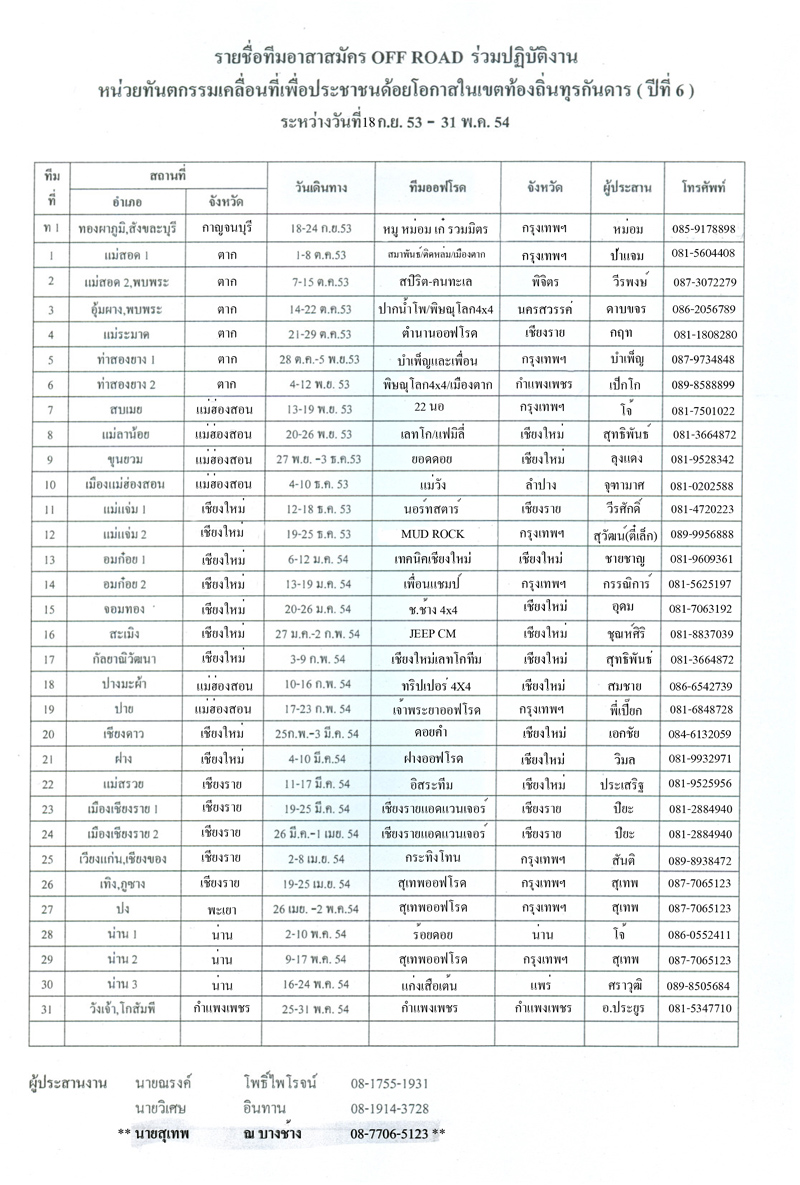 ขอเรียนเพื่อนสมาชิกเพื่อทราบดังนี้นะครับ ในเรื่องการออกปฎิบัติงานร่วมกับมูลนิธิแพทย์อาสา พอ.สว.ซึ่งปีนี้เป็นปีที่ 6 .ในนามเพื่อนแชมป์โดยความเห็นชอบจากคณะกรรมการบริหารกลุ่มได้รับทริปเพื่อออกปฏิบัติงานเป็นทีมที่ 14 พื้นที่ อำเภออมก๋อย2 จังหวัดเชียงใหม่ ส่วนทีมที่ 5 อำเภอท่าสองยาง1 จังหวัดตากนั้น เป็นทีมที่อาสาเฉพาะกิจของหน่วยทันตกรรมเคลื่อนที่ พอ.สว ซึ่งสมาชิกเพื่อนแชมป์หรือกลุ่มอื่นเป็นอาสาเฉพาะกิจอยู่ การออกปฏิบัติงานหรือร่วมออกปฎิบัติงานผู้ที่เป็นอาสาสมัคร ของมูลนิธิแพทย์อาสา พอ.สว. ให้พกบัตรประจำตัวไปด้วย ส่วนเพื่อนสมาชิกทั่วไปของเพื่อนแชมป์ที่จะร่วมไปปฎิบัติ กิจกรรมเสริม เช่น ต้านภัยหนาว เลี้ยงอาหารเด็กนักเรียน หรืออื่นๆ นั้นสามารถทำได้โดยวันเวลาตามแต่เพื่อนสมาชิกจะสะดวกค่าใช้จ่ายส่วนตัว นอนเต้ท์ ส่วนอาสาสมัครนั้นก็ขอให้ปฎิบัติตามคำสั่งของทางมูลนิธิฯ อย่างเคร่งครัด และขอให้เพื่อนสมาชิกที่เป็นอาสาสมัครโปรดลงชื่อ-สกุล ทะเบียนรถ คนขับและผู้นำทาง รวมเป็นทีม เพื่อที่จะดำเนินการออกคำสั่งตามกรรมวิธีต่อไป