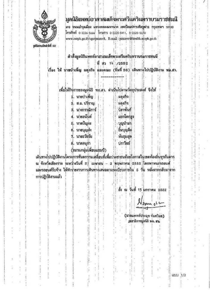 1.เรื่องตามรายชื่อที่แนบมา ทางมูลนิธิฯมีข้อจำกัดเรื่องหลักการในจำนวนรายชื่อที่จะออกคำสั่ง แต่มิได้จำกัดจำนวนเพื่อนสมาชิกที่จะเข้าร่วมปฎิบัติหน้าที่ออกหน่วยแพทย์แต่อย่างใด จำนวนคนและรถเท่าไหร่ก็ย่อมได้เพราะไปในนามชมรมกลุ่มออฟโรด "กลุ่มเพื่อนแชมป์" เพียงแต่ว่าสมาชิกท่านใดไม่มีชื่อตามคำสั่งเวลาไปปฎิบัติงาน ให้ลงชื่อที่สมุดปฎิบัติงานในพื้นที่นั้นๆ ผลการปฎิบัติงานของเพื่อนสมาชิกจะถูกส่งมาเก็บที่ส่วนกลางเป็นประวัติการปฎิบัติงานในมูลนิธิแพทย์อาสา พอ.สว. สืบไป