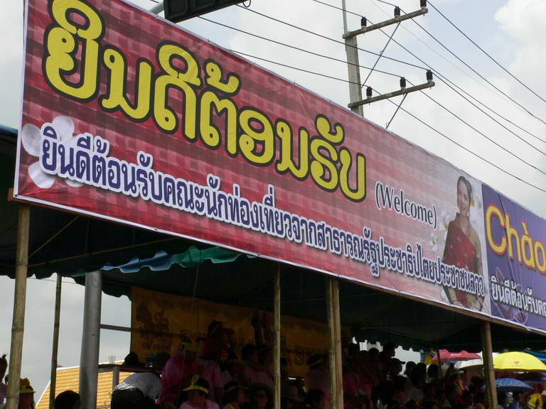 นักท่องเที่ยวชาวลาวมากันเป็นคณะใหญ่มากจนต้องจัดเป็นซุ้มต้อนรับพิเศษ