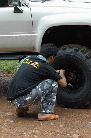 เช้าก่อนออกเดินทาง จาร์ยให้ดูการทำช่วงล่างของรถแต่ละแบบ ว่ามีแบบไหนบ้าง เดี๋ยวเข้าไปป่า จะได้เห็นข้อดีข้อเสียของแต่ละแบบ