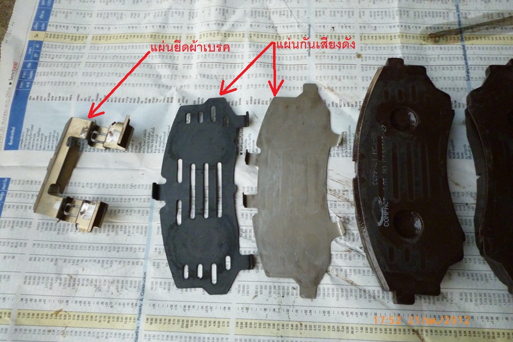 ลองตรวจดู แผ่นกันเสียงดัง 2แผ่น ที่ประกอบอยู่กับแผ่นดิสเบรคทั้งสองข้าง ว่าชำรุดเสียหายหรือไม่ และตรวจดูความเสียหายของ แผ่นยึดดิสเบรคกับคาริเปอร์ด้วย พอดีผมมาตรวจเรืออยู่ที่เกาะสีชัง เลยไม่มีรูปให้ดู เพราะรูปที่ผมเคยถ่ายไว้อยู่กับคอมฯออฟฟิส อีกวันสองวันจะเอาให้ดู เดียวพอเห็นปุ๊บก็จะร้องอ้อทันที