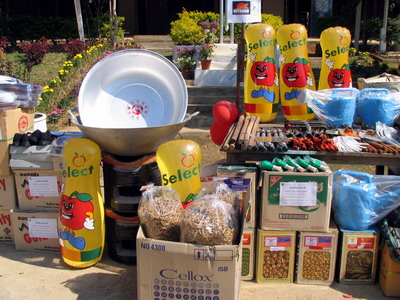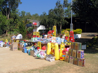 ถ้วย ชาม สมุด ดินสอ ของเล่นต่างๆ รวมทั้งอุปกรณ์การเกษตร