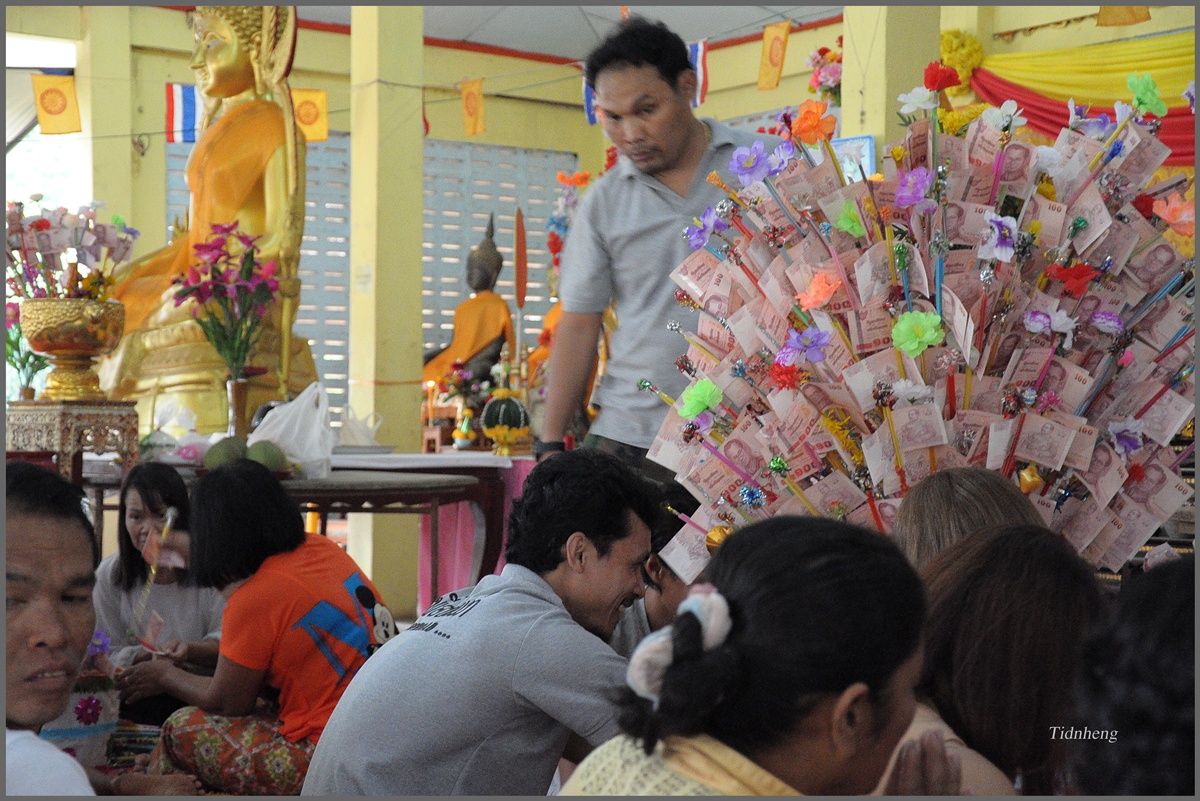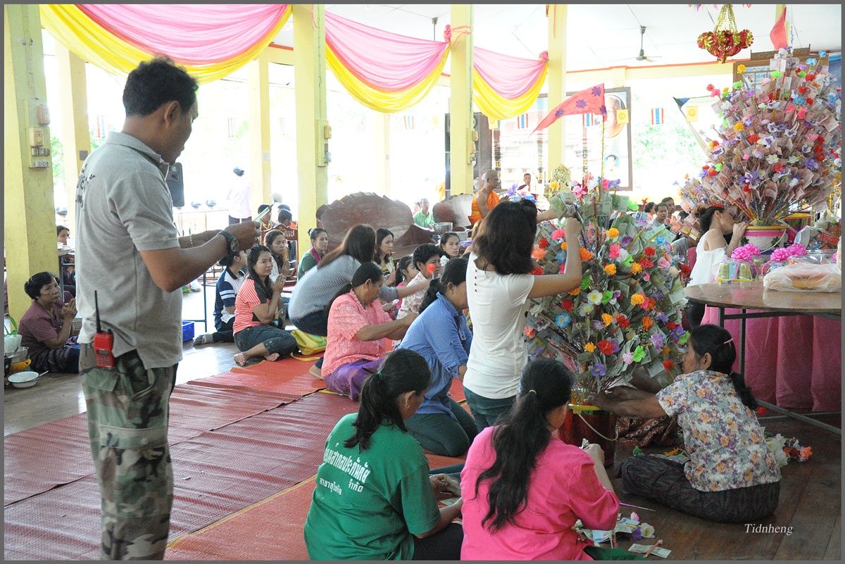 หลายคนช่วยกันจัดเงินจากซองประดับต้นกฐิน