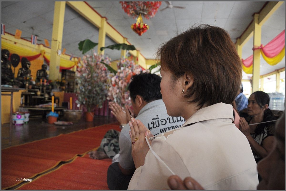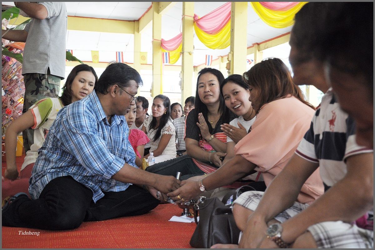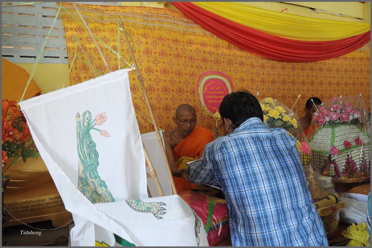 พระเจ้าอาวาสรับประเคนด้วยการนำสายสิญจ์ล้อมรอบของถวายทั้งหมด แล้วให้พวกเราพร้อมทั้งชาวบ้านได้ถวายพร้อมกันโดยถ้วนหน้า ผมเองก็ได้เกาะใบบุญเฮียณรงค์และเจ๊ตุ่นไปในคราวเดียวกัน