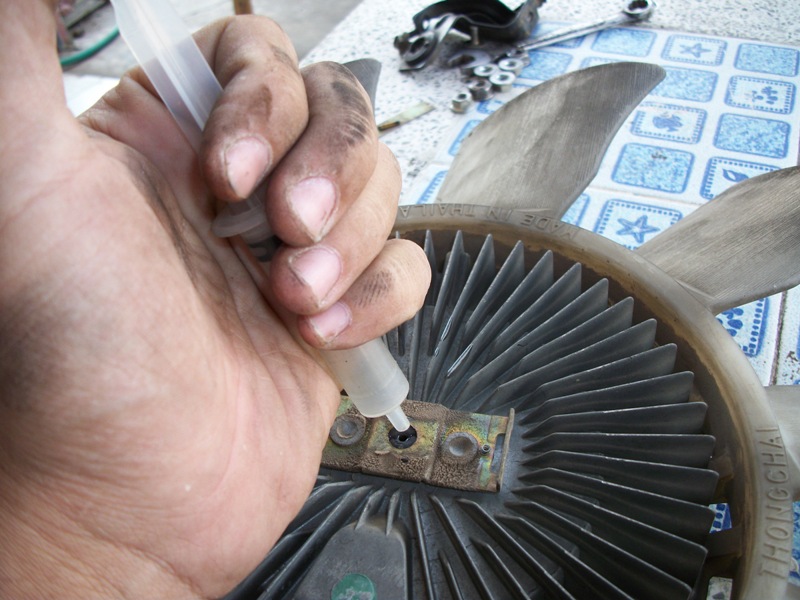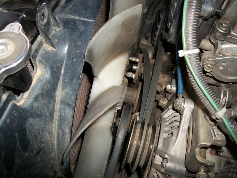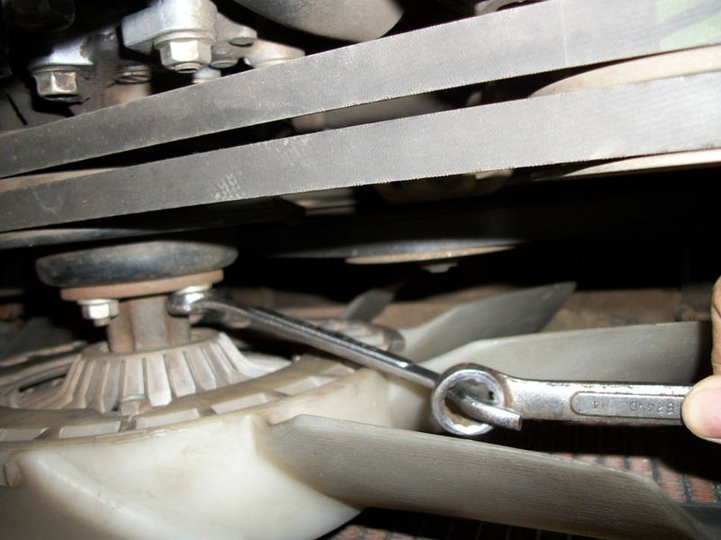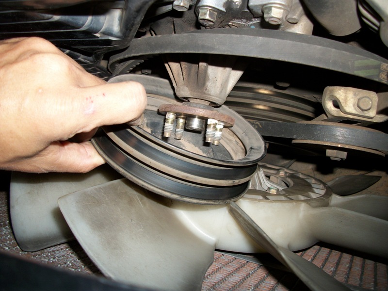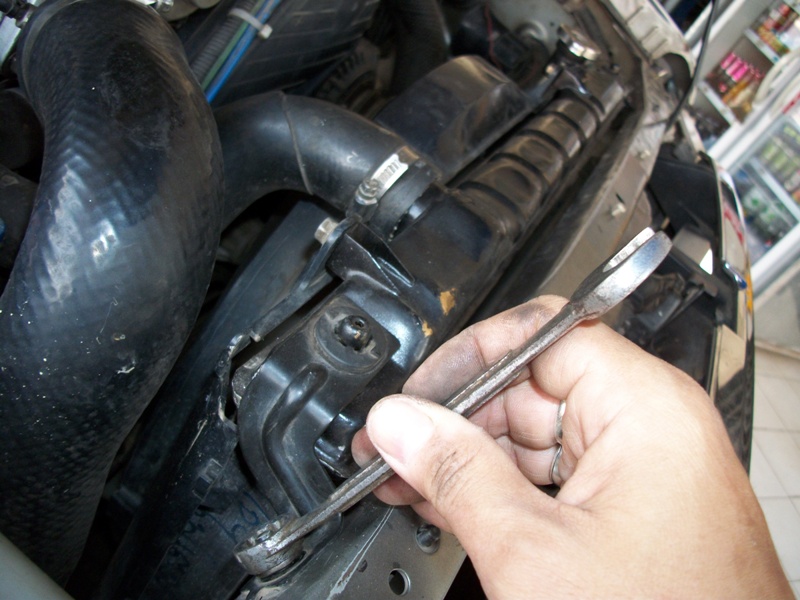 เอาพัดลมฟรีปั๊มออกครับ เอามือข้างนึงเหนี่ยวหม้อน้ำให้ชิดคานหน้ารถก่อนนะครับ แล้วพัดลมมันจะออกได้แบบเบียดๆหน่อย