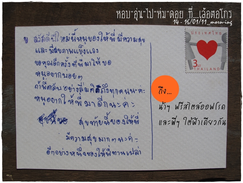 การ์ดใบนี้แอบทำเราอึ้ง...ตอนที่น้องส่งคืน พออ่านข้อความไปเรื่อยๆ เจอประโยคที่ว่า "พวกเค้ามีความสุข แล้วเราล่ะสุขไหมที่ได้มาเจอกับพวกเค้าที่นี่ เล่นเอาน้ำตาเกือบไหลให้ทุกคนเห็นซะแล้ว... เป็นน้องผู้ชายด้วยนะ ถ้าอ่านจบตอนที่เค้าอยู่ตรงนั้น คงจะรีบตอบทันที "ดูที่รอยยิ้มพวกพี่สิ ยิ้มกว้าง หัวเราะซะปากกว้างจนจะถึงใบหูแล้วนี่ เสียงหัวเราะดังซะขนาดนี้ พวกพี่มีความสุขขนาดไหน"