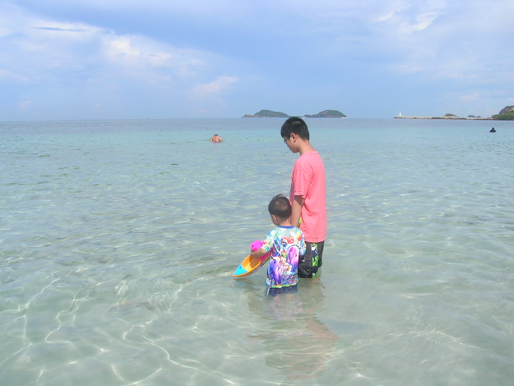 น้ำใสแบบมองเห็นปลาในขดหินเลย สองพีน้องมองหากันอยู่ ที่นี้น่าจะเป็นหาดที่สะอาดสุดในชลบุรี แต่ความสะดวกมีน้อย ไม่มีเก้าอี้ ร่มกันแดด อาหารต้องโทรสั่งให้เขาส่งมา