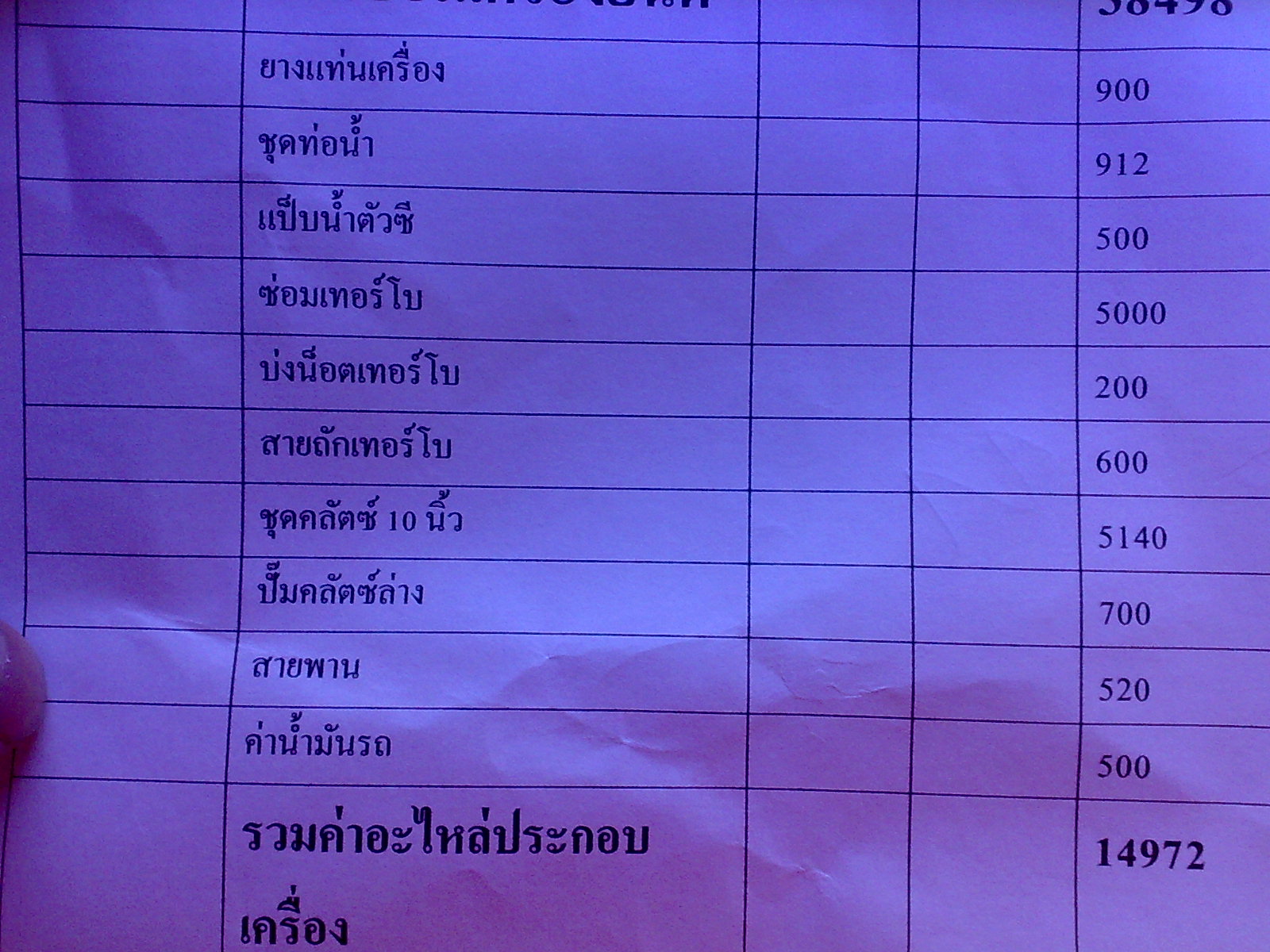 ไม่มีคำแก้ตัวครับ ผมเองก็มีส่วนผิดครับที่รับงานซ้ำซ้อนกันจนเกินกำลังตัวเอง จนบางงานทำให้ช้าเกินไปอันนี้ต้องขอโทษจริงๆครับ ส่วนราคาค่าอะไหล่ถ้าพี่คิดว่าแพงผมพูดตรงๆเลยครับ ผมแทบจะไม่ได้บวกอะไรเพิ่มเลยนะครับพี่ลองเช็คราคาดูได้ ส่วนอะไหล่ผมก็ไม้ได้คิดเงินเพิ่มอีกหลายตัวด้วยอย่าง ก้านสูบผมมีที่บ้านอยู่ผมก็ไม่ได้คิดเงิน ไฟหน้าอีกสองดวงมันขาดผมมีที่บ้านถอดจากรถผมเองแบบน้ำไม่เข้าผมก็เปลี่ยนให้ ส่วนที่ว่าลูกปืนไดร์ชาร์ทที่เปลี่ยนเพราะมันแตกจริิงๆ ลูกปืนกดคลัตซ์มันก็ติดจริง เพราะมีแต่สนิมลูกลังครับ ส่วนเรื่องค่าแรงรวมกับค่าท่อหายใจไปด้วย ค่าปั๊มแย็คโซล่าไปด้วย ซึ่งท่อหายใจผมก็รอพี่เข้ามาทำ