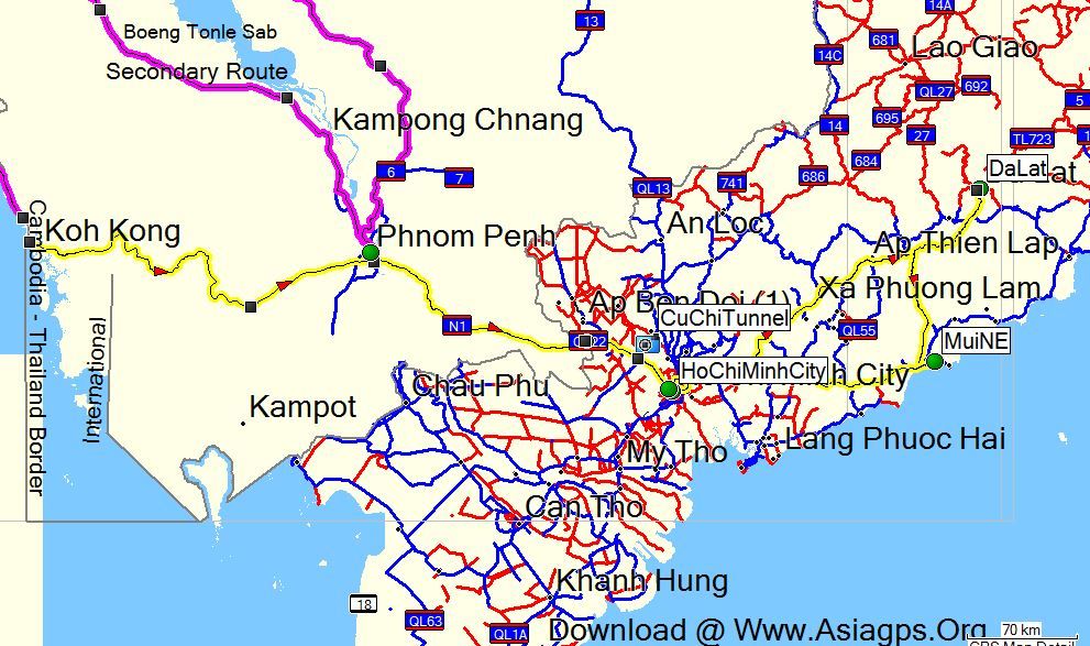 ระยะทางการเดินทางไปกลับในต่างประเทศประมาณ 1800-1900 กม. เส้นทางไม่ลำบากมากนัก มีจุดข้ามแพขนานยนต์ 1 แห่งบนเส้นทางระหว่างพนมเปญไปยังชายแดนกัมพูชา-เวียดนาม