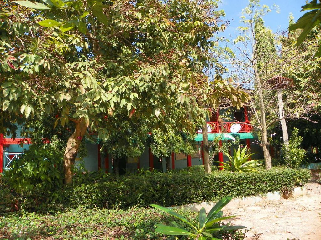 ภาพอาคารเรียนอยู่หลังต้นไม้ที่ปลูกชิดอาคาร ทำให้ถ่ายภาพอาคาร มองเห็นได้บางส่วนนะครับ
