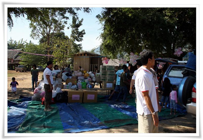 เมื่อเราเดินทางมาถึงโรงเรียนก็นำโต๊ะโครงเหล็กพื้นไม้ที่เพื่อนผู้มีจิตศรัทธาทำและมอบให้มาสดๆ ร้อนๆ เรานำลงมาตั้งไว้แล้วทะยอยนำเอาของบริจาคจำนวนมากมาวางไว้เป็นจำนวนมากมาย