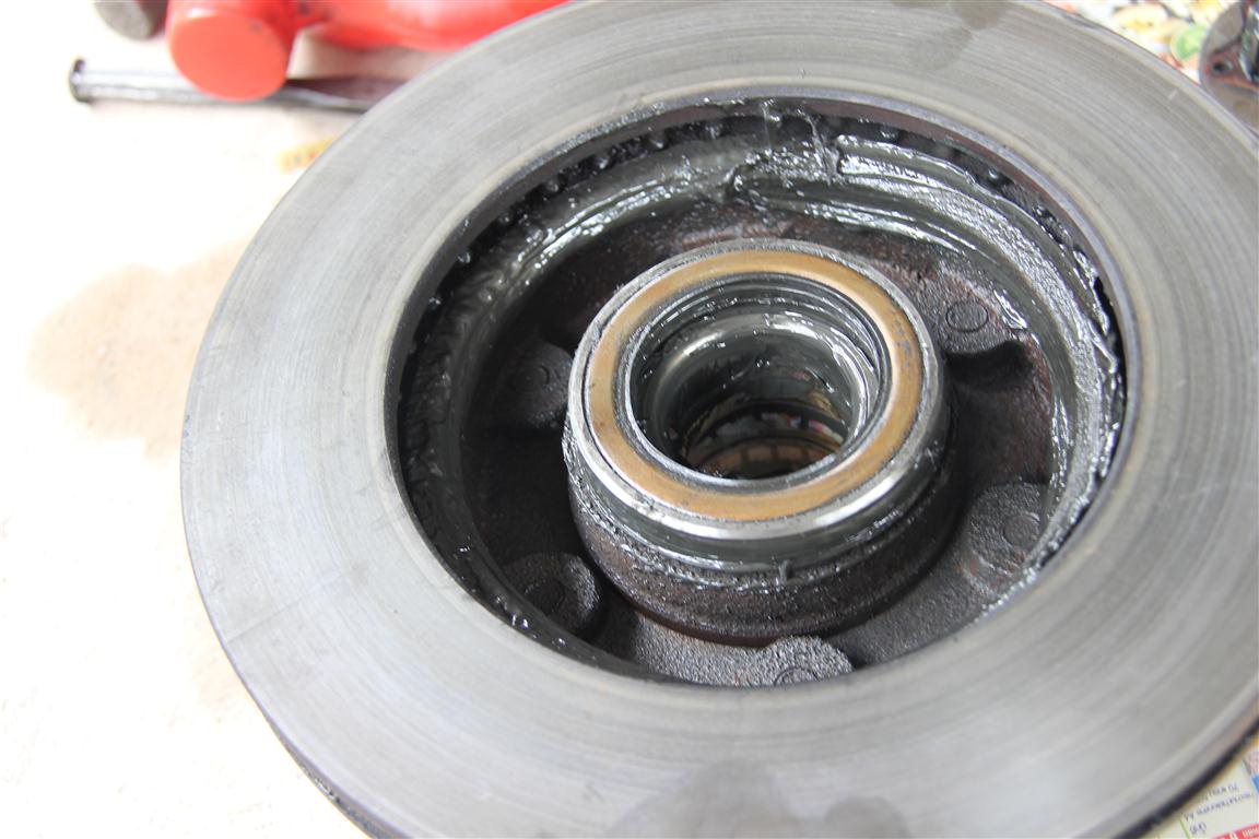 งานเข้าอีกแล้ว หลังจากไปทดสอบมา จาระบีไหลออกมาที่ด้านหลังจานเบรค ถอดออกมาดูแล้วเป็นอย่างนี้ครับ