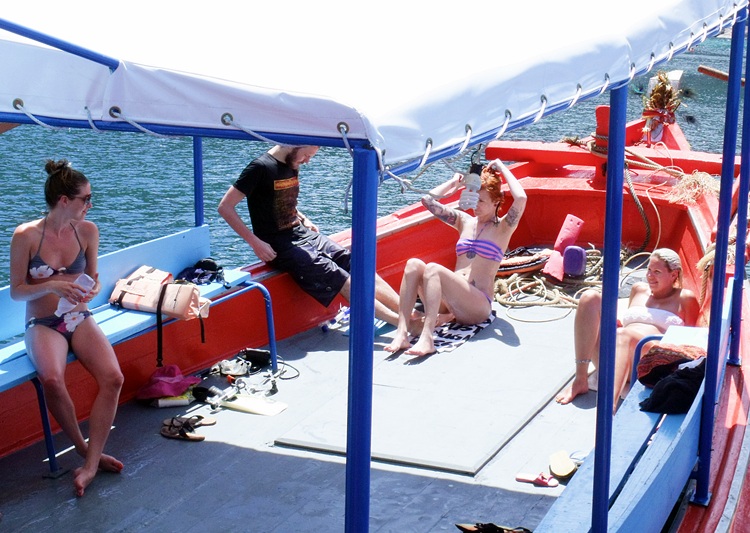 เรือที่จะพาไปดำน้ำจะเป็นเรือประมงดัดแปลงค่อนข้างจากโคลงมาก ใครเมาเรือควรจะกินยาแก้เมาดักไว้ซะก่อน