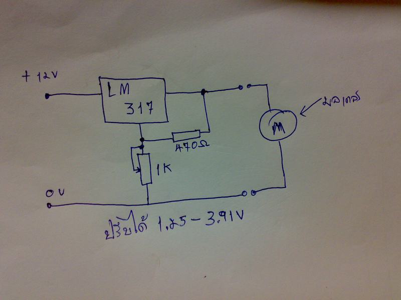 คราวนี้เกิดปัญหาขึ้นมาว่า อยากจ่ายไฟแค่ 12 โวลต์โดยให้อุปกรณ์ทั้งหมดทำงาน ซึ่งมอเตอร์ทำงานอยู่ที่ 1.5 โวลต์ ดีที่สุด(หมุนได้เอื่อยๆพอดี ไม่ตีน้ำให้กระจายมาก)...