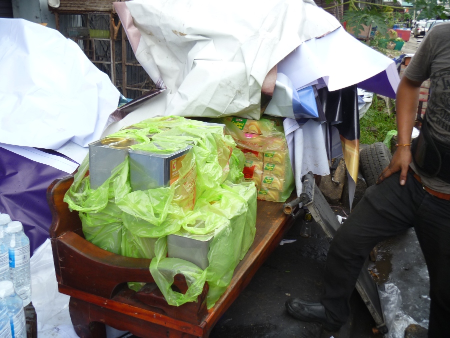 ที่คลุมไว้เป็นถุงยังชีพที่จัดไว้แล้วกองด้านใน กองด้านนอกรอจัดเย็นวันนี้...