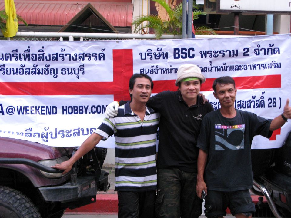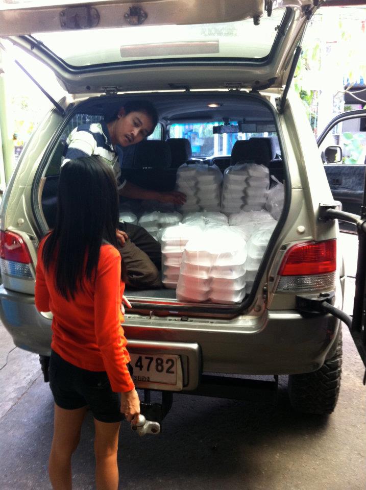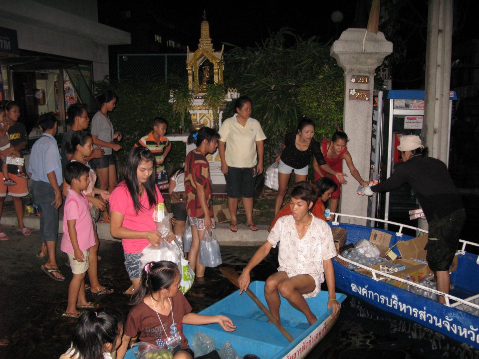 วันที่10/11/2011 ชมรมดนตรีโรงเรียนอัสสัมชัญ+Kia@weekendhobby.com+ชุมชนหมู่ 8 บางประกอก+สภากาชาดร่วมกันนำข้าวกล่อง 300 กล่อง+น้ำดื่ม 1200 ขวด+ถุงขยะ+นม+ไม้ขีดไฟ และ ฯลฯนำส่งมอบให้ผู้ประสพภัย ณ.ซอยเพชรเกษม 52+54