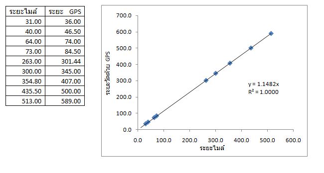 ทริปที่ผ่านมาก็เลยทดลองจด ระยะไมล์เทียบกับระยะ GPS แล้วนำมาพล็อตกราฟใน excel เพื่อหาตัวคูณเพิ่ม
