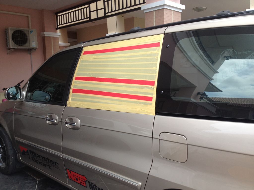 จอดไว้เฉยๆ ข้างฟุตบาท. แตกเป็นเม็ดข้าวโพดเลย ตอนนี้เอาเทปกาวแปะอยู่่. บานนี้แพงมั้ยน้อ สั่งที่ไหนดีครับพี่พี่