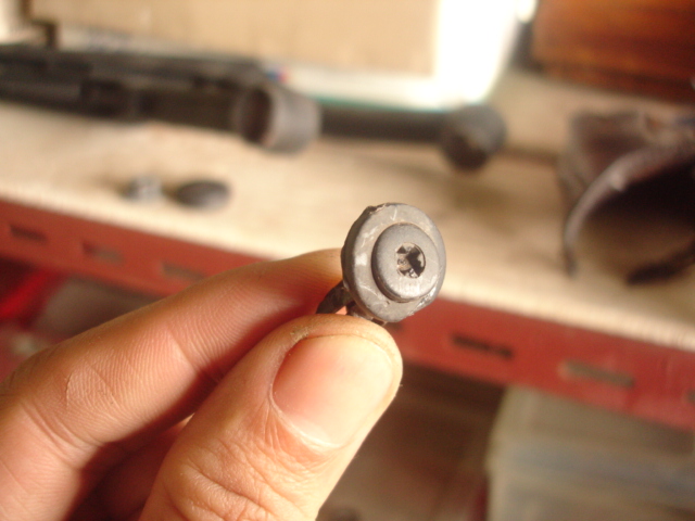 ต่อมาถอดน้อตหัวแฉกที่แผ่นกันน้ำ ของผมไม่เคยถอดเลย ด้งนั้นจึงได้เป็นแบบนี้ครับ งัดเลย (แฮ่ แฮ่ ก็มันไม่ออก คิดว่าค่อยซื้อมาใส่ใหม่ คิดการใหญ่ ต้องไม่คิดเล็กคิดน้อย ดังนั้นงัดออกหมด 4 ตัว)