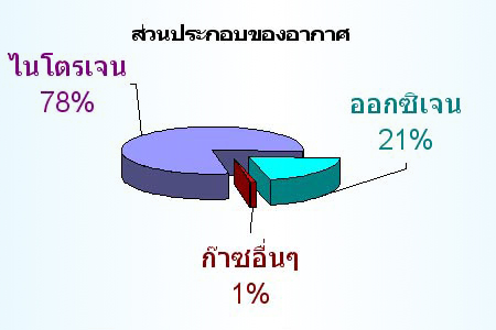 ประกอบด้วยไนโตรเจน(ประมาณ 78%โดยปริมาตร)และออกซิเจน( ประมาณ21%)ส่วนที่เหลืออีก1%ประกอบด้วยคาร์บอนไดออกไซค์ และก๊าซอื่น ๆ เช่น ไฮโดรเจน อิเลี่ยม นิออน และอาร์กอน