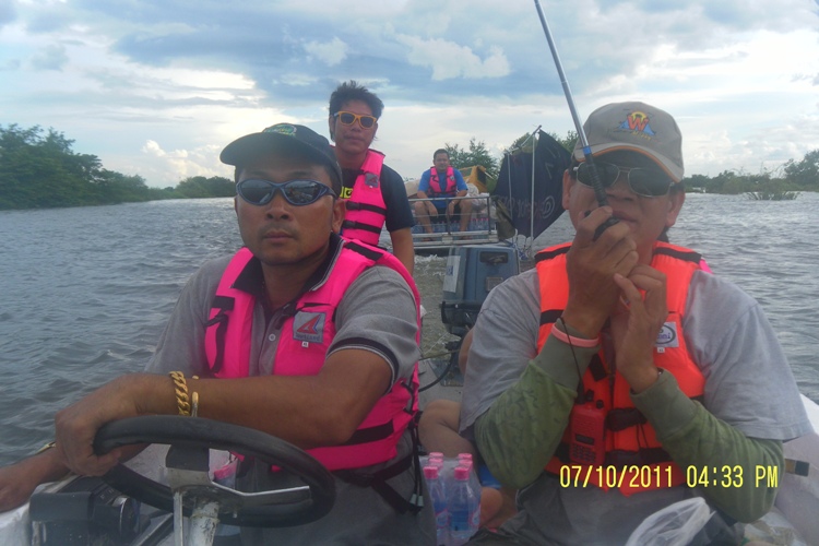 ภาพนี้เป็นรถดำน้ำ หลังคารถต่ำกว่าผิวน้ำประมาณ 1 เมตร จมน้ำอยู่บนถนนคันคลองชลประทาน...