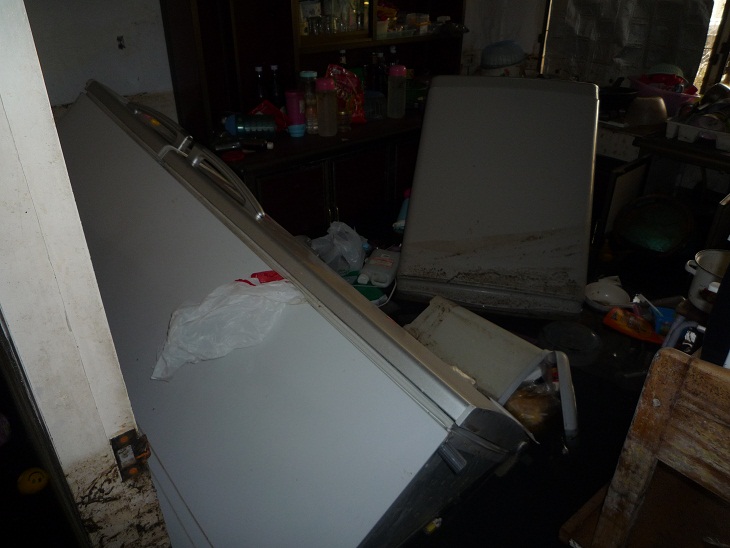 ห้องครัวตู้เย็นเครื่องซักผ้าเอามาหลบไว้ก็ล้มหมด น้ำมาสูงมากเข้าเลยหน้าต่าง3นิ้วได้