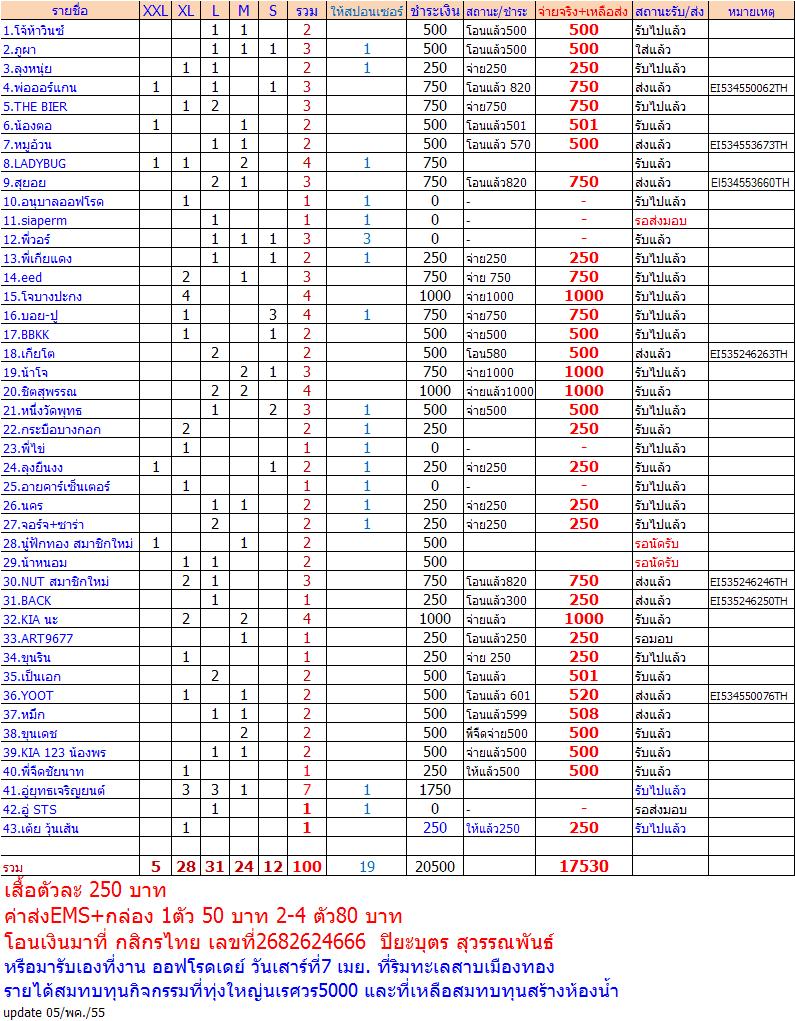 ยอดชำระค่าเสื้อ 16,280 บาท (ที่ยังเหลือจากสมาชิกนำมาสมทบทีหลัง)