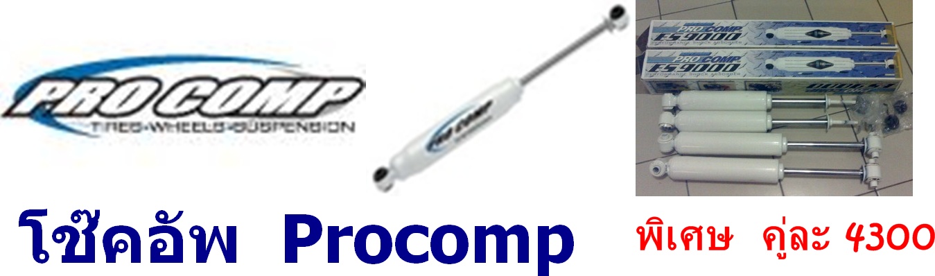 โปรคอม ผลิตภัณฑ์นำเข้าจาก USA มีทั้ง โช๊คอัพ หลากหลายรุ่น และ ชุดยกสอง 2-4 นิ้ว สำหรับ รถยนต์ OFF ROAD ทั่งแหนบ และ คอยล์สปริง -โช๊คอัพมีหลายรุ่น ไม่ว่าจะเป็นโช๊คแก๊สผสมน้ำมัน โช๊คอัพแบบน้ำมัน และโช๊คอัพออกแบบ พิเศษ เช่น PROCOMP MX6 ที่ปรับแต่งความนุ่ม แข๊งได้ 6 ระดับ และโช๊คอัพ PRO COMP รุ่น R แบบซับแทงค์ ที่สามารถ เติมแก๊สเพิ่มความหนึบนุ่ม เพื่อตอบสนองความชอบและสไตร์การขับขี่แต่ละบุคคลได้
