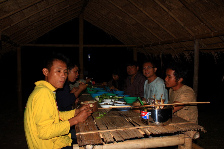 ไม่รู้ว่าใครยังมีเต็นท์รุ่นแบบนี้ใช้อยู่บ้าง เสาอลูมิเนียมหน้าหลังครับ แต่คราวนี้เอาง่ายๆ กางแทนมุ้ง และใช้กันลม อยู่ใต้เพิงใบจาก ไม่ต้องกลัวฝน