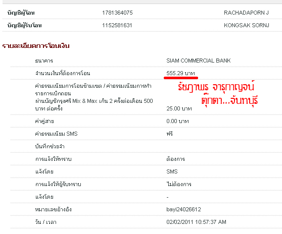 โอนแล้วครับ 555 บาท เวลา08:43 วันที่ 5/2/2011 B669B060