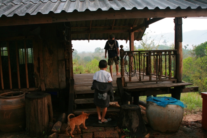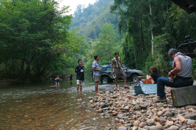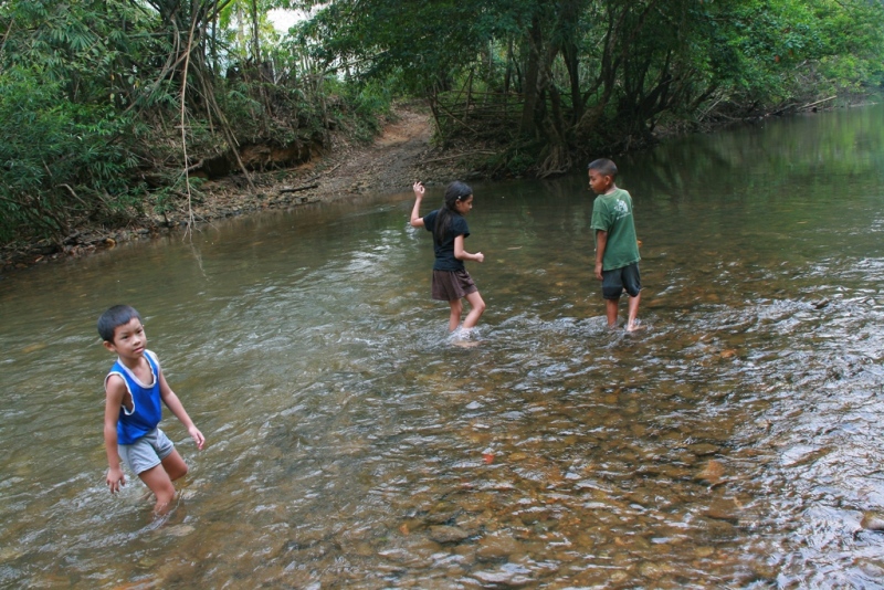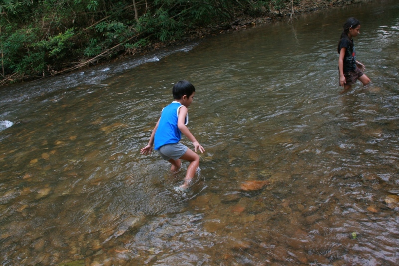 เช้าวันใหม่ น้องทิวกับพี่โจ้นั่งเล่นริมห้วย