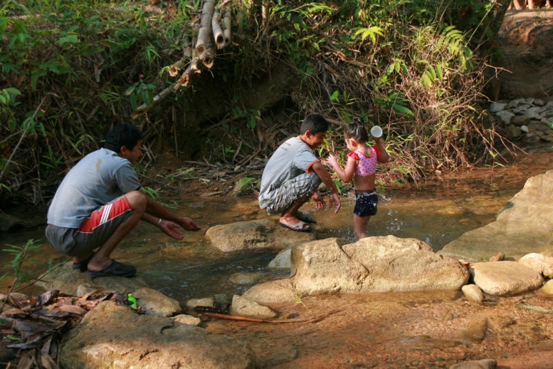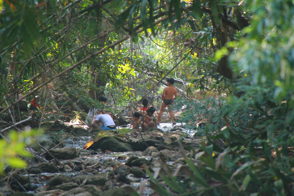 เด็กที่ตามพ่อแม่มาเล่นน้ำสงกรานต์กลางป่า