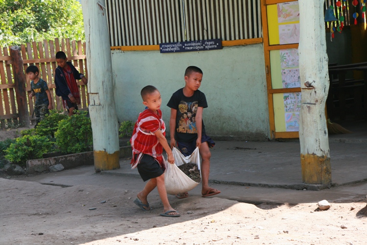 เด็กนักเรียนช่วยขนดินปรับระดับพื้นก่อนเทพื้น ค.ส.ล...