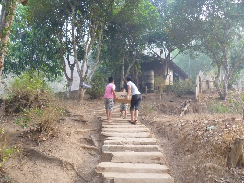 เด็กนักเรียนมากันแต่เช้า ช่วยกันยก คอมฯ ขึ้นโรงเรียน...