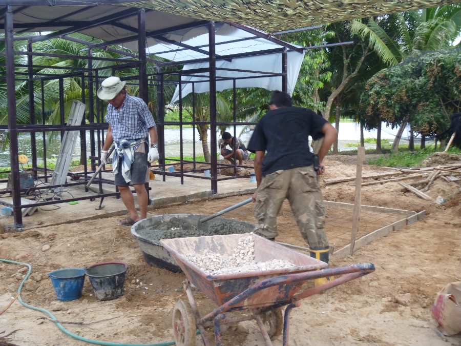 เช้ามาช่างเหล็กทำเหล็ก สารพัดช่างปรับดินตั้งแบบ บ่ายแก่ๆเริ่มผสมปูน...