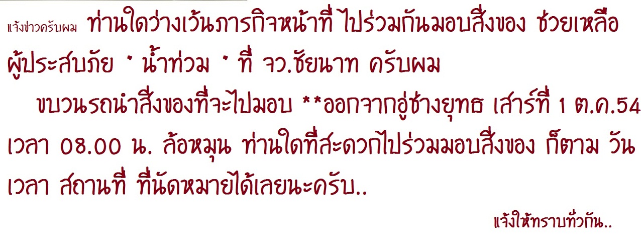 ผมเปลี่ยนแปลงนิดหน่อยครับ จากวันพุธ เป็น พฤหัส เย็นๆๆจะนำของไปที่อู่ STS ครับเนื่องจากรอรวบรวมจากคนที่อยากร่วมช่วยเหลืออยู่ครับ ( ก็คงไม่ได้มาก )