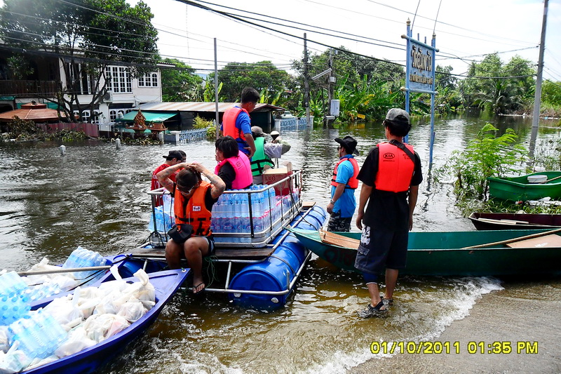 มีชาวบ้านมาบอกว่า มี 20 ครอบครัวโดนน้ำขังมานาน ความช่วยเหลือเข้าไม่ถึงเพราะถ้าออกไปทางข้างหน้าจะไกลมาก แต่มีทางลัดที่ต้องผ่านบ้านคนอื่นเข้าไปได้ หนึ่งวัดพุทธ เกียขาว และยืนงง จึงจัดของและเรือยางขนผ่านบ้านผู้ใจดีเข้าไป